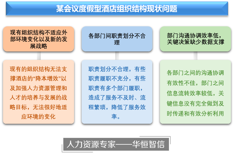 该酒店在业务发展的同时,也面临多方面的问题。首先,现有的酒店组织结构是十年前适应环境的产物,近年来随着外部环境的变化,酒店的发展战略也几次变更,但是酒店经过摸索与实践后,组织结构对战略的支持始终存在不足,在实际工作中遇到了很多问题,具体表现为组织效率低下,工作落实中出现职能重叠、推诿扯皮现象较多。在酒店面临疫情、导致效益受损时,制定了新的战略规划,如何让组织结构能够更好地适应未来战略发展的需要,正是困扰酒店管理者的问题。通过多轮的内部研讨与分析,酒店高层领导决定聘请专业第三方来帮助酒店实现发展战略的落地并解决组织结构存在的问题,经过多轮的招投标工作,北京华恒智信人力资源咨询公司凭借其优秀的专业能力获得酒店领导的认可,对酒店开展发展战略与组织结构的诊断与梳理,提出优化改革方案。