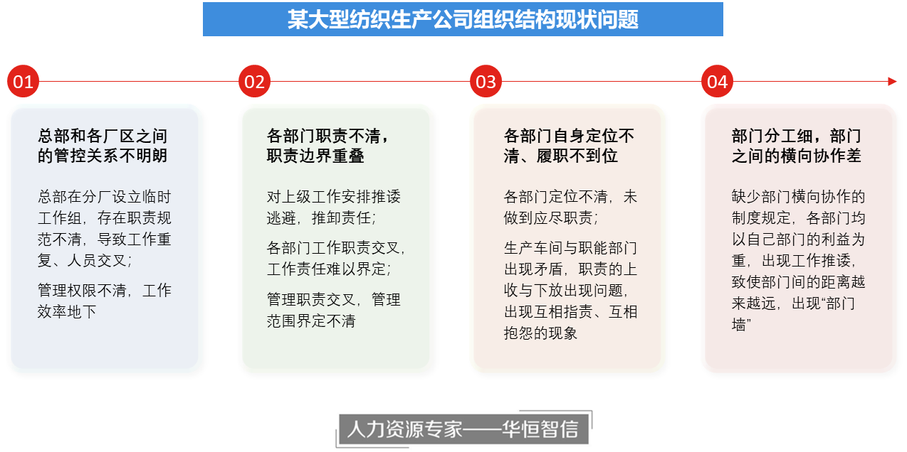 随着公司业务发展,产量增加,公司及时引入新的生产线,并建立了多处生产分厂,多处场地的建设虽然带来了经营方面的业绩增长,对管理方面却带来了难度,多处设置机构、管理人员增加、分厂和总部的联系效率低下等,都导致成本上升。近年来,面对更加激烈的市场竞争环境以及疫情影响,公司经营发展受限,相比之下,成本逐年增高,暴露出以往管理基础不足、运营效率低下的情况。因此,公司提出了改革挖潜的口号,为了降低成本、提高管理效率,需要对现有的相对臃肿的组织结构进行优化。现有的组织机构存在总部和分厂的管理权限不清晰、协作效率低、部门职责边界交叉、职责欠缺、面对工作存在推诿扯皮现象、职能部门对下属生产车间管理不到位等,影响了公司下一步转型发展。该公司决定借助专业第三方的力量,对组织结构方面开展优化,经过多轮选择和竞标,多年从事人力资源咨询的专业公司——华恒智信脱颖而出,双方建立了合作关系。