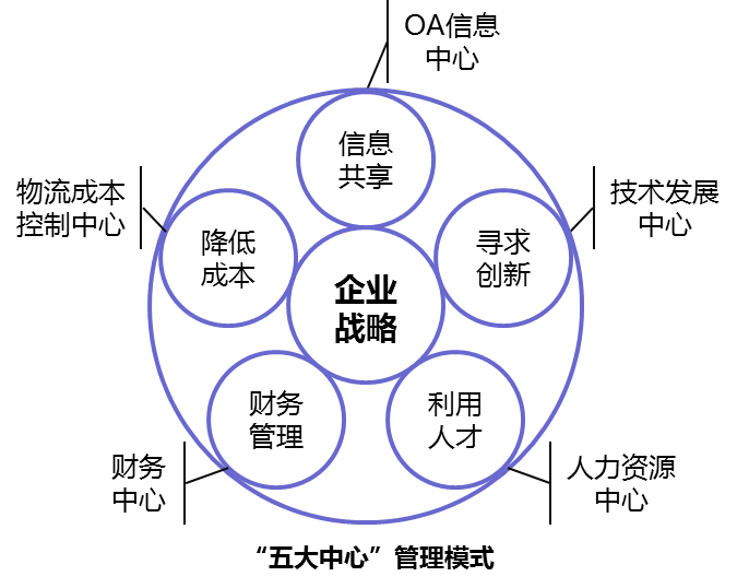 在“一个核心,五大支撑”的管理模式下,实现大一统的集团管控目标,实现资源共享、信息共享,提高效率。