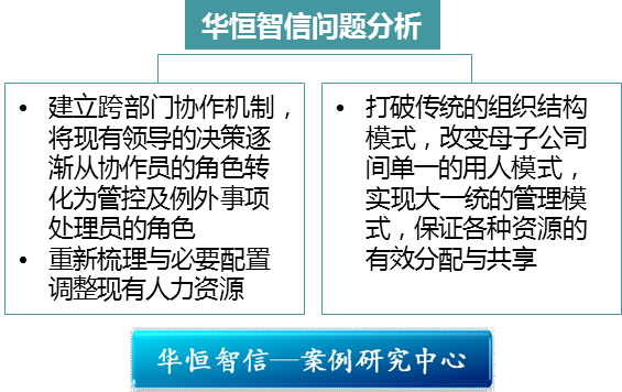 集团与各子公司单一用人的模式,使得内部资源不能有效地整合运用,导致资源的浪费,不能使组织整体绩效得以提高,所以建议打破传统的组织结构模式及改变母子公司间单一的用人模式,在子公司独立发展与集团把控方面达到平衡,实现大一统的管理模式,保证各种资源的有效分配与共享。