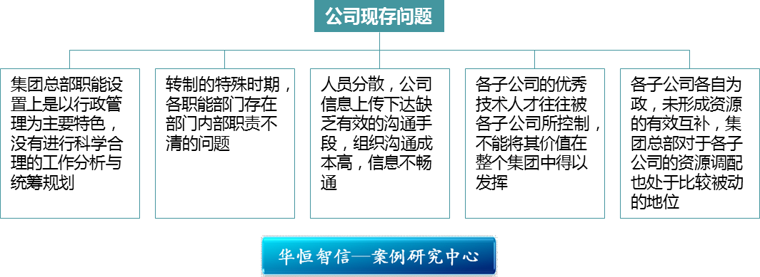 该建筑企业是一个拥有十多个下属子公司的企业集团,集团总部设有12个部门,集团公司副总级别领导达9个之多。在集团总部职能设置上是以行政管理为主要特色,没有进行科学合理的工作分析与统筹规划;在转制的特殊时期,各职能部门普遍反映存在部门内部职责,职能部门之间,职能部门与子公司之间,管理与协调,主办与协办职责不清的现象存在;另外,由于集团公司及各子公司业务特点,各项目地点分布于全国各地,点多面广,人员分散,公司信息上传下达缺乏有效的沟通手段,组织沟通成本高,信息图畅通;同时,各子公司的优秀技术人才往往被各子公司所控制,不能将其价值在整个集团中得以发挥;各子公司各自为政,实力强的公司占用各种资源,而实力弱的公司处于劣势,各子公司之间未形成资源的有效互补,集团总部对于各子公司的资源调配也处于比较被动的地位,不利于集团对各子公司的总体把控。