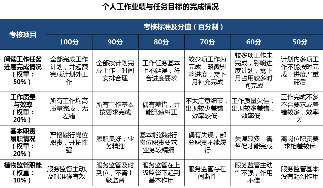 (1)个人工作业绩与任务目标的完成情况,考核表如下: