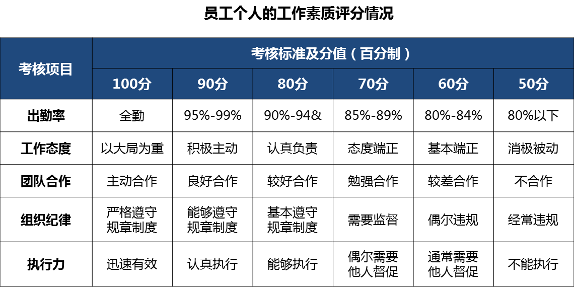 (2)个人综合素质(包括出勤率、工作态度、团队合作、组织纪律等项考核指标),考核表如下,由上级打分: