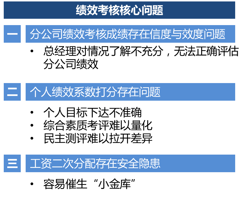 各分公司的工资总额是由集团总部下拨的,其中固定部分基本上相对不变,绩效工资部分是浮动薪资,是根据总经理的绩效打分下发到分公司处,各分公司进行二次考核再落实到每位员工的绩效工资。但每个员工绩效考核系数是根据“个人工作业绩与任务目标的完成情况”、“个人的综合素质”和“民主测评”三部分得分算来的,并不能确保每个员工最后的绩效工资加起来的总额跟公司总部下发下来的工资总额数额一致,这就容易催生各分公司内部小金库的问题。但这个问题现在并没有引起公司高层的意识和重视,其实有不少集团公司在对二级子公司管理时,二级单位出现过“小金库现象”,如果剩余资金管理不善或监督不到位,是很容易出现安全问题的。