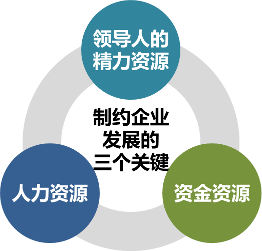 企业发展通常受到三个关键资源的制约,第一,是企业领导人(一把手)的精力资源,往往领导人关心的地方、主抓的工作就会到位;第二,是企业的人力资源,一个企业有多少优秀核心人才;第三,是企业的资金资源,即能够支撑企业发展资金多少。