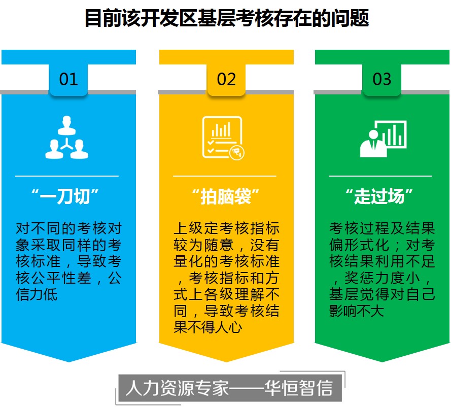 早在几年前,根据上级文件指示,为了加强党建工作、基层管理工作的落实,以及促进开发区发展工作,对基层村干部的考核已经开始实行,各村执行上级下发的考核办法,并根据考核结果进行奖励批评。然而,在长期的管理过程中,渐渐出现了不少无法解决的问题,例如各个村对考评结果抱怨不公平,各项重点任务需要上级压着做,再三强调要扣分的重要任务却年年无法完成等。开发区领导只能强派任务,层层下压目标,却反而引起基层干部的不满,工作进展效果不佳,收效甚微。在困惑中该开发区领导找到了专业的人力资源管理咨询公司华恒智信来进行调研、帮忙解决问题。