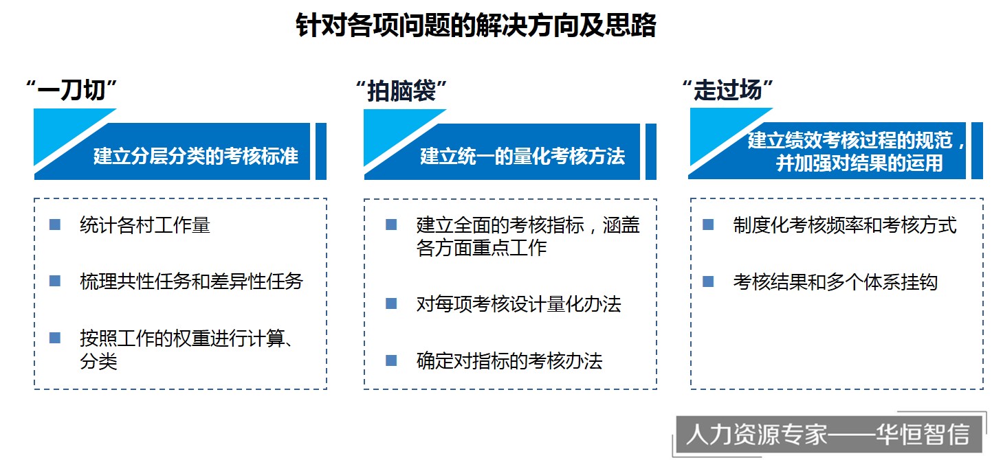 1、建立分层分类的考核标准。在深入了解本地区战略发展方向以及各个村级单位的实际情况后,华恒智信专家老师提出两套方案来对各村进行分层分类。并经过介绍优势与不足、听取客户意见后,采取更具针对性的办法,即通过对各项任务的工作量进行统计并设置权重的办法,对现有的近三十个村级单位进行了分类。在此基础上,对各个村级单位的共性任务和差异性任务进行梳理,并突出各村的核心工作职责,梳理岗位工作的考核指标,确定了考核主体、指标细则、权重比例以及考核频率,例如招商引资的工作量比例较大,则分配较大的权重、较低的考核频率;日常行政事务的工作量较大,则制定较多的指标细则,分配较小的权重、较高的考核频率等。这样进行分类,为科学合理的绩效考核提供了必要的基础,在考核时,对不同的序列的村可以运用同样的考核细则、不同的考核幅度,突出其工作量大的工作的权重,这样的考核结果更容易获得大家的认可。