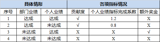 部门员工绩效=部门绩效奖金*员工贡献度*个人业绩指标完成系数+额外奖励