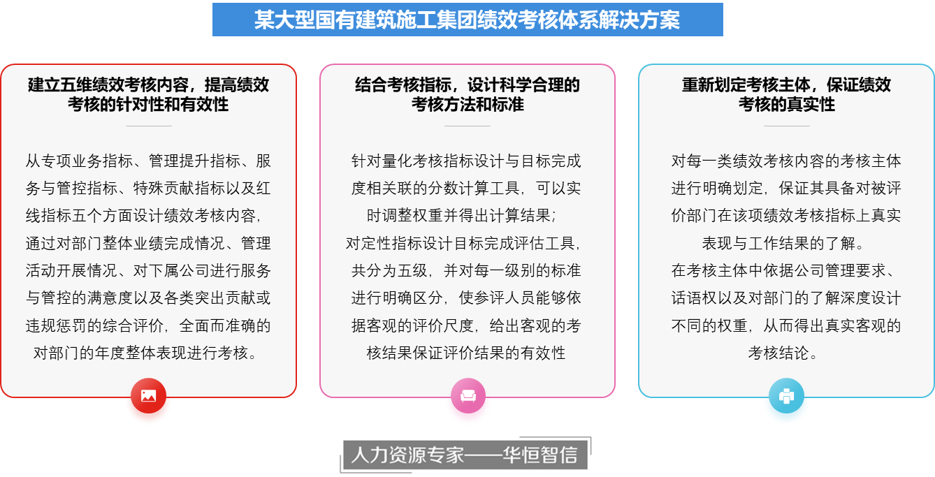 绩效考核是实现企业各项发展目标的一种程序和方法,合理的绩效考核能促进企业发展,使企业形成积极向上的企业文化,进而保持与提高企业员工的整体工作情况与实际绩效,完成企业业绩增长目标。通过完善绩效考核体系,提升企业绩效管理效率,进一步完善企业经营与管理方法,从而提高企业的核心竞争力,保持企业效益持续发展。绩效考核是一个完整的闭环过程,从部门和岗位的分析、考核目标的制定与下达、实施过程的监督到最后的结果反馈与落实。华恒智信作为专业的人力资源管理咨询公司,凭借多年项目经验和对不同类型公司绩效考核现状的深入分析,对处于不同发展阶段的各类型公司如何做好绩效考核工作有深入的研究,能够帮助企业设计科学、专业的绩效考核体系,做好人力资源体系的改革,提高人力资源的利用效率。