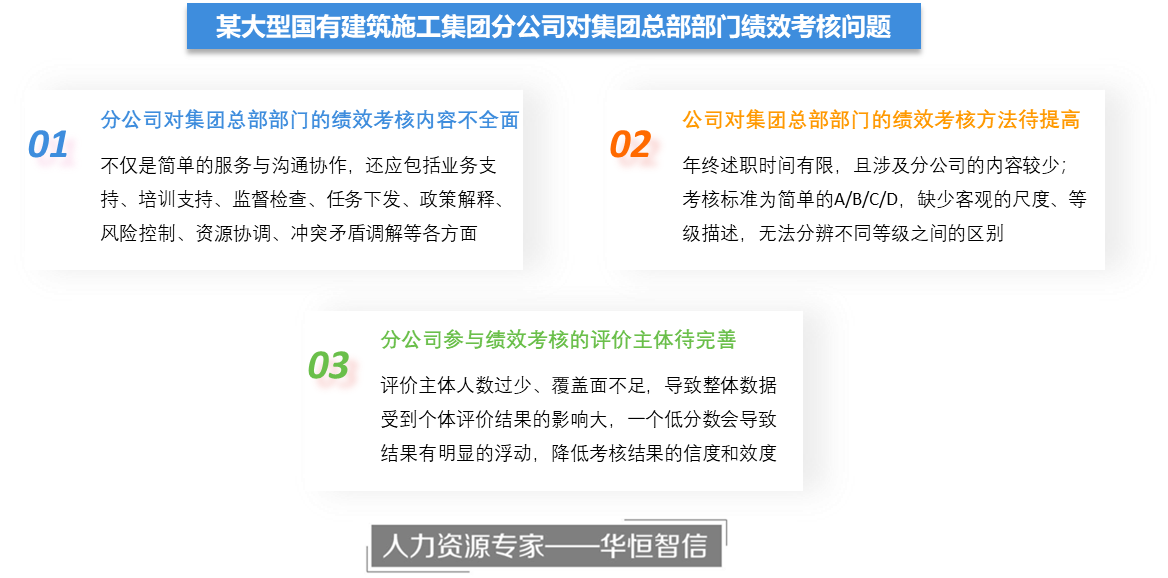 结合公司实际情况,华恒智信开展对集团总部历史绩效考核文件和绩效考核开展情况的调研,通过全面的总结和分析,目前公司在绩效考核方面存在以下三方面问题: