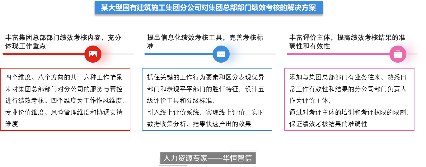 通过对现有分公司对集团总部部门绩效考核现状问题的了解和分析,华恒智信提出丰富内容、完善工具标准、明确考核主体的三部分解决方案: