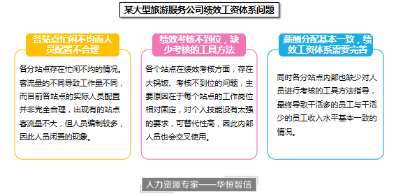 北京华恒智信项目组抵达现场后,对客运公司的现状进行了现场访谈调研工作。目前客运公司共设立分站点7个,其中6个位于景区内部或周边,1个位于当地高铁站。通过现场调研,项目组发现,各个站点在绩效考核方面,存在大锅饭、考核不到位的问题,导致“大锅饭”的主要原因在于每个站点的工作岗位相对固定,包括售票、检票、发车等,对个人技能没有太强的要求,可替代性高,因此内部人员也会交叉使用;同时各分站点内部也缺少对人员进行考核的工具方法指导,最终导致干活多的员工与干活少的员工收入水平基本一致的情况。