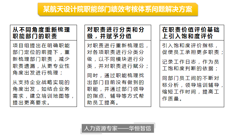 一般而言,企业实施的员工绩效考核是以业绩为导向的考核方式,而职能部门由于没有业绩指标,工作很难进行量化,如果仍然采用业绩考核方式,往往不太科学,也不太准确。而职能部门如何量化考核也是人力资源管理的一大难题,在该案例中,华恒智信顾问专家团队提出职责价值评价加饱和度评价的量化考核方法,实现对职能类人员的科学评价。
