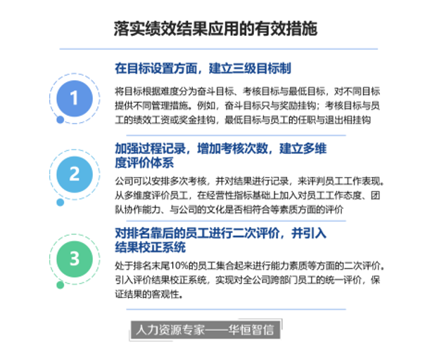 针对该公司员工担心被淘汰,制定目标时比较保守,导致考核成绩拉不开差距的问题,华恒智信专家组建议该公司设立三级目标制,将目标根据难度大小分为奋斗目标、考核目标与最低目标,对不同级别的目标提供不同管理措施。例如,奋斗目标与高奖励挂钩,鼓励员工勇于报高目标;将考核目标与员工的绩效工资或奖金挂钩,该目标要求主要由上级下达,激励员工认真工作,激发工作积极性;最低目标与员工的任职与退出相挂钩,目标要求来自于岗位的任职要求,如果员工完不成最低目标,再考虑将员工淘汰。