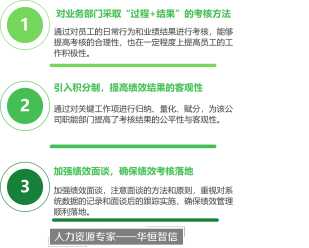 针对领导定性打分缺少客观性的问题,华恒智信建议引入积分制。由于职能部门的工作偏向事务性,难以量化,华恒智信为该公司职能部门总结关键工作项,为工作项完成的质量、数量不同进行赋分。比如,办公室部门组织服务会议,一个月组织五次以上,取得很好效果并得到大家好评反馈较多,分数就高;组织会议效果不好,大家反响较低,分数就低。通过对关键工作项进行归纳、量化、赋分,为该公司职能部门提高了考核结果的公平性与客观性。