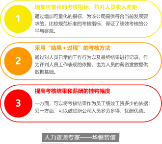 该企业在运用绩效考核时,出现了考而不用的问题,以至于考核结果没有发挥出真正的价值。因此,华恒智信项目组在为新公司设计绩效考核体系时,建议提高考核结果和薪酬的挂钩幅度。一方面,可以将考核结果作为员工绩效工资多少的依据,当月考核与当月薪资挂钩,年度考核与年度奖金挂钩;另一方面,可以鼓励新公司人员多劳多得,优酬优绩。从而提高新公司的效益,实现战略目标。