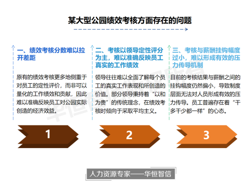 对此该单位领导比较苦恼,希望能够通过绩效管理自上而下传导压力,提高人员对创收的积极性和主动性,能够为公园的效益贡献出价值。经过商讨决定,该公园领导希望通过专业的人力资源专家——华恒智信,帮助公园建立科学可行的绩效考核体系来解决公园人员积极性不高的问题,从而实现效益提升。