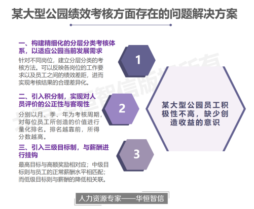 结合对该公园目前绩效考核问题的现状分析,华恒智信团队以提高员工工作积极性,激励员工实现更多业绩为目标,针对以上问题,提出了以下解决方案: