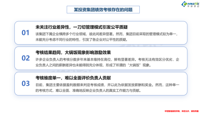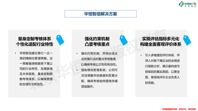 针对当前该集团存在的考核维度片面的问题,华恒智信项目组提出,引入多维度的评价体系,并深入对各下属企业的业绩进行细致分析,揭示盈利或亏损背后的真实原因,以更全面、客观地评价企业负责人的贡献。