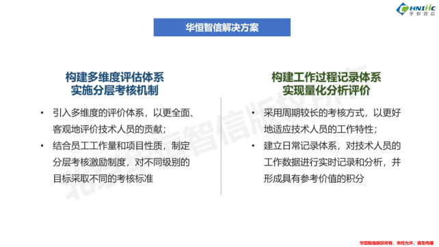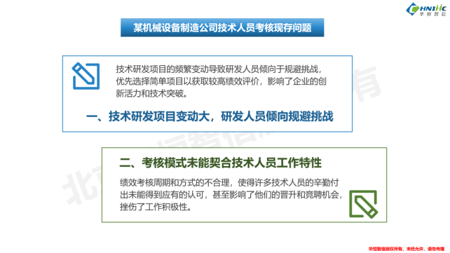 针对当前该公司技术研发项目变动大,研发人员倾向规避挑战的问题,华恒智信项目组提出,引入多维度的评价体系,以更全面、客观地评价技术人员的贡献;同时,制定分层考核激励制度,对不同级别的目标采取不同的考核标准。