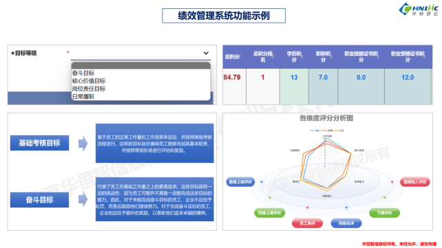 在对该公司现状有了初步认识后,华恒智信的专家老师经过多次探讨,建议该公司引入绩效管理系统,以有效平衡技术人员的岗位特性与公司考核成本之间的关系。系统功能介绍如下: