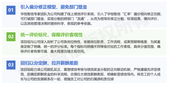 本案例中,某国有房地产投资公司的绩效考核体系问题逐渐凸显,为此领导邀请了华恒智信专家团队对其优化变革,助力企业的进一步发展。针对打分松紧不一、评分标准模糊、绩效薪酬错位等问题,华恒智信团队深入调研、精准把脉,针对三大顽疾各施妙手:引入偏分修正模型,消除因部门领导风格各异、工作性质差异导致的评分差异,为科学决策筑牢根基;量身定制统一评价标尺,细化各岗位考核指标,从模糊定性评价转向精准定量评价,压缩主观判断空间;重塑以分定酬机制,先评绩效再定奖金,合理拉开薪酬差距,激发全员奋进动力,强化员工归属感与责任感。