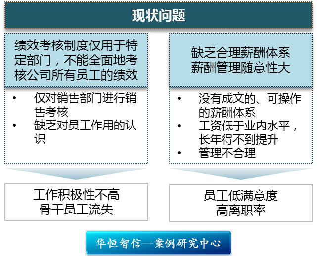 经过对B公司各方面管理现状和方法的详细了解和深入分析,华恒智信顾问专家团队指出高员工流失率的问题根源在于缺乏一套科学、合理的人力资源管理体系。结合公司的发展阶段和特点,华恒智信提出B公司可以先从薪酬和绩效考核体系入手,逐步搭建、完善人力资源管理体系,以有效支撑企业的战略发展。该公司在薪酬和绩效考核体系的主要问题如下: