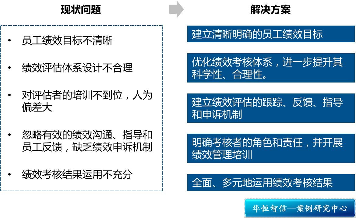4、建立绩效评估的跟踪、反馈、指导和申诉机制。为保障绩效考核体系的有效实施和落地,华恒智信顾问专家指出,该公司人力资源部门在评估前根据评估目的、内容、对象等制定评估程序,使评估工作有序推进,并持续跟踪了解员工绩效目标的完成情况,全面收集反映员工工作绩效的反馈信息,设立申诉程序,让员工有地方或有渠道对评估情况进行反映或申诉,从制度上促进绩效评估工作的合理化,化解评估矛盾。