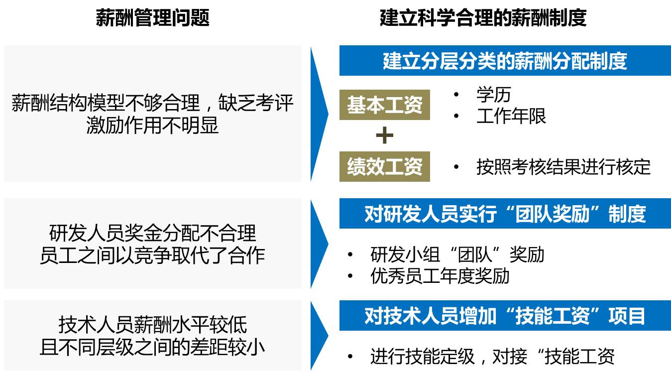 1、以“基本工资+绩效工资”为整体的薪酬结构,建立分层分类的薪酬分配制度,即,按照不同岗位的工作特点建立不同的薪酬分配制度。其中,基本工资以学历、工作年限等因素为主,只要员工能取得一定的学历证书并达到一定的工作年限即可拿到相应的基本工资,这一部分的工资金额不高,但是能保障员工的基本生活,且与公司的整体业绩及员工个人的业绩并不挂钩,以这种方式鼓励员工长期工作。在帮助该企业建立了科学的绩效考核制度的基础上,员工的绩效工资按照考核结果进行核定,以这种方式实现“多劳多得”,以起到真正的激励作用,提升员工的工作积极性。