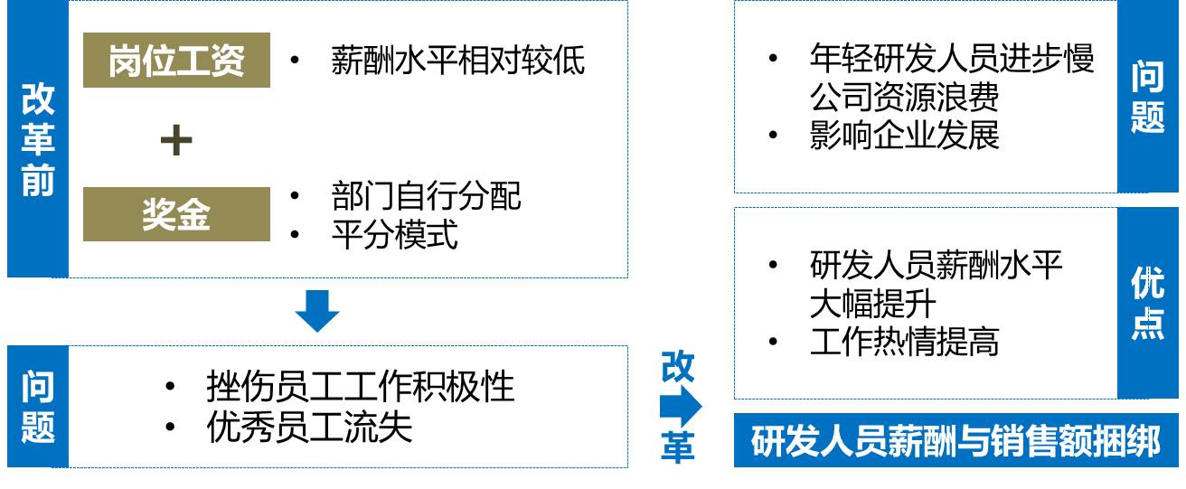 2、对研发人员实行“团队奖励”制度,促进团队之间的合作。与以往奖励研发人员“个体” 不同,改革后实行对研发小组的“团队”奖励,其数额按照该团队所研发产品的市场销售额的一定比例进行提取。团队奖励由研发组长进行二次分配。以这种方式,促进员工之间的知识共享,只有整个团队的业绩提升,研发人员个体才能得到较高的收益,因此,研发人员也愿意与其他人分享知识和经验,以促进团队业绩的提升。同时,由于研发小组组长对成员的工作表现和各方面的能力有全面的了解,将奖金二次分配的权利下放给研发小组组长可尽量保证奖金分配的公平、公正。此外,为了进一步保留优秀人才,此次改革设计了“优秀员工年度奖励”的模式,即根据研发人员的个体工作表现和团队工作业绩,与年底进行评定,选拔优秀员工进行一定的奖励,以进一步提升其工作积极性。