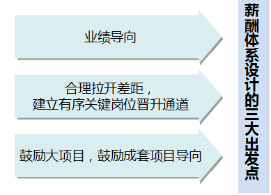 根据该贸易公司的业务特点,其能够持久发展首先来源于业绩的不断提升,因此有效的业绩管理既是该公司发展的需要,也是其倡导的一种现实文化特征,所以,业绩导向是薪酬体系设计的出发点之一;同时,作为一个快速发展的贸易企业,由于原有业务分配模式虽然鼓励了项目开拓,但是缺乏战略导向,缺乏风险与责任对等,长此以往,个人收益与组织收益会产生严重不平衡,因此在现有资源基础上需要鼓励大项目,鼓励成套项目,支持和实现组织的持久与稳定发展,这也是企业发展与个人发展的真正需要,所以,鼓励大项目,鼓励成套项目导向是薪酬体系设计的第二出发点;另外,合理拉开差距,建立有序关键岗位晋升通道,即各类岗位收入因组织定位重新评估,确定相应价值,实现基本收入与个人能力风险责任挂钩,浮动收入与业绩大小挂钩,是薪酬体系设计的第三出发点。