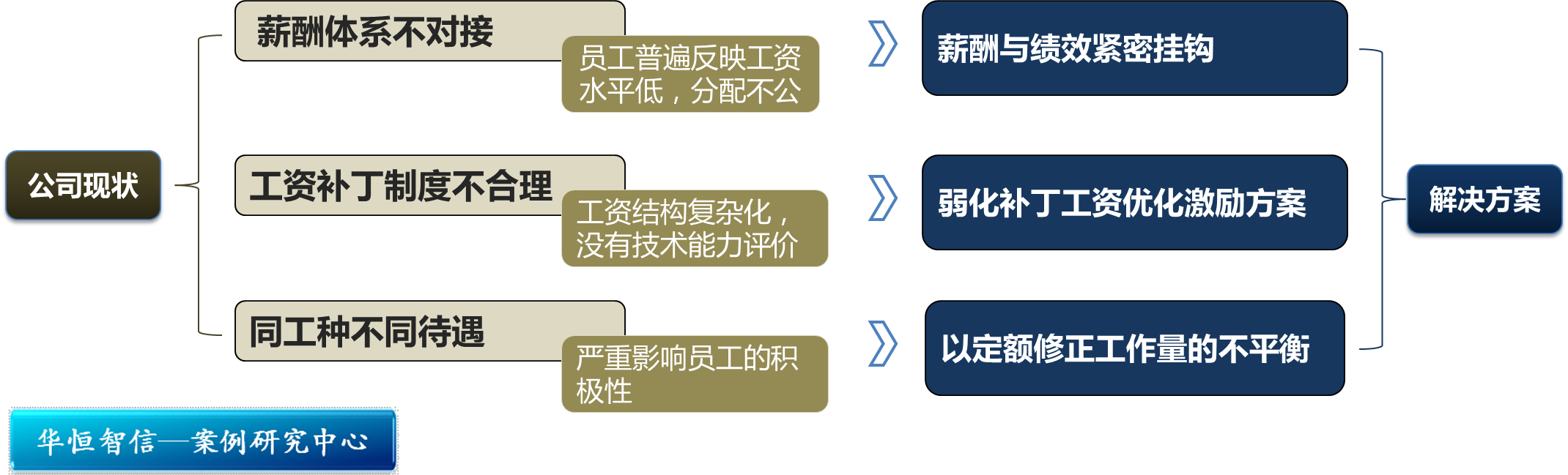 华恒智信建议在保持工资总额不降低的前提下,尽可能将补丁工资进行弱化,将部分补丁揉入到单价中,另外提出新的激励方案(激励鼓励一线人员多看台以提高产量,对完成定额之外的部分进行激励;对班组长提出生产奖金,即充分调动一线班组长的工作积极性,对其管理的人员在多完成定额之后以给予奖励体现)。对于劳动量承包部分也是紧密围绕本岗位的工作内容与要求,如果属于本岗位应该做的工作内容,不再设劳动量承包,如果对于本岗位工作范围之外的,如果多工作了,给予劳动量承包奖励,但要在保证自己工作完成的基础上。