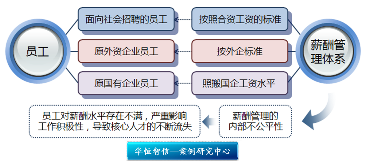 目前,该公司的员工主要由三部分组成:原国有企业员工,原外资企业员工,以及面向社会招聘的员工,这种人事组成结构的复杂性导致了薪酬体系的内部复杂性,原国企员工照搬国企工资水平,原外企员工按外企标准拿很高的外资企业补贴,合资公司招聘的员工按照合资工资的标准发放薪酬。三种截然不同的薪酬管理体系导致了薪酬管理的内部不公平性,员工对薪酬水平也存在较大的不满,严重影响了工作积极性,甚至导致核心人才的不断流失。鉴于此,该公司领导决定实施薪酬改革,统一公司内部薪酬标准。但是新的薪酬标准带有浓烈的国企色彩,固定基本工资与岗位工资占了很大的比重,而浮动绩效工资只占很少的一部分,无法体现员工间岗位、素质、贡献的差异。这与追求效率和激发员工积极性的外企薪酬标准形成了鲜明地对比。薪酬改革不但没有消除员工的不满,反而将矛盾进一步升级。