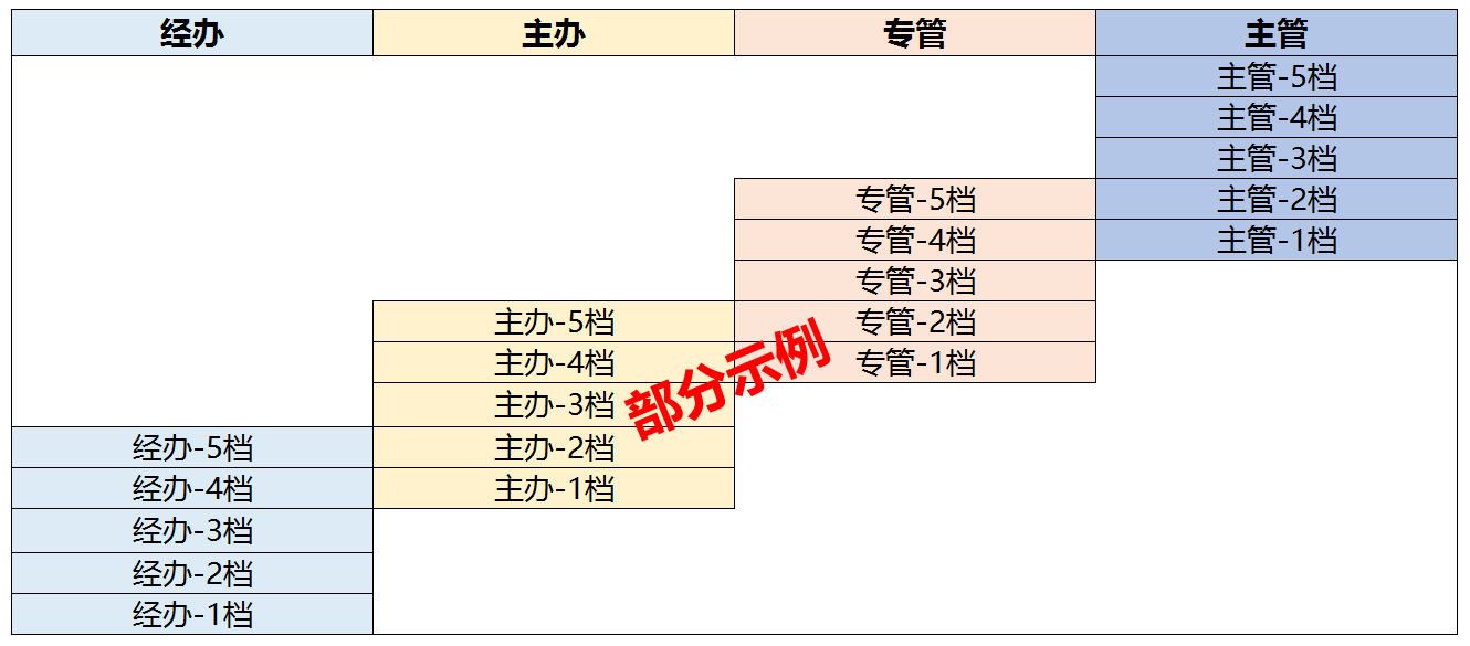 首先,在薪酬设计思路上引入“宽带薪酬”,代替原有的等级分明的垂直型薪酬结构。一方面,在原本的经办、主办、专管、主管等四个岗级的基础上,增加对各岗级内部的进一步层级划分要求,如,原本经办级员工只有一个岗位等级,在宽带薪酬中,我们将一个岗级划分为五个档级,增加员工薪酬等级的数量。另一方面,秉承“宽带薪酬”的思想,为了鼓励更多能人出现,鼓励员工承担更多的责任,设计并引入了不同岗级之间的重叠等级,保证优秀的年轻员工可以拿到与更高岗级员工相同的工资。