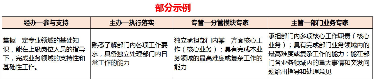 其次,明确企业不同岗级与档级划分的依据,引入职责角色评定法确定岗级,结合员工任职资格的胜任情况确定员工档级。职责角色评定法,即基于不同岗级员工在日常职责履行定位来区分岗级:经办为参与支持角色、主办是执行落实角色、专管是分管模块专家角色、主管是部门业务专家的定位角色。在此基础上,细化相应的等级说明以及评估方法作为后期操作使用。同时,根据细化的学历、工作经验、专业能力、知识技能等任职资格要求,对员工初始档级以及外来人员档级确认提供了相应的评价工具。
