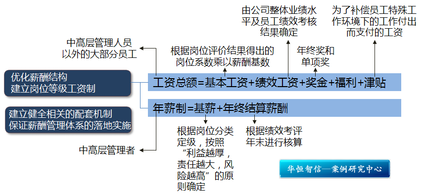 通过对该公司管理现状及薪酬管理体系的深入分析,华恒智信顾问团队针对上述问题提出了解决措施,并为该公司搭建了完善的薪酬管理体系,具体如下: