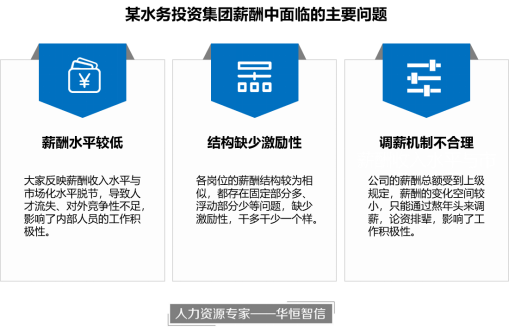 在过去的发展过程中,凭借着政策支持、运营方面的优势,公司得以快速发展。近年来随着水利项目多数进入维护阶段,以及内部员工的更新换代,公司在管理方面的问题阻碍了进一步发展。经过企业内部调查,这些问题主要体现在员工薪酬多年没有提升、调薪机制不合理、干多干少一个样、人才逐渐流失、员工积极性下降等各个方面。该公司经过多次尝试,由于岗位类型较多、历史包袱较重,始终效果不佳,因此决定借助专业第三方的力量,针对薪酬体系开展改革。经过多轮选择和竞标,该公司选择了常年从事人力资源咨询的专业公司华恒智信作为合作单位。