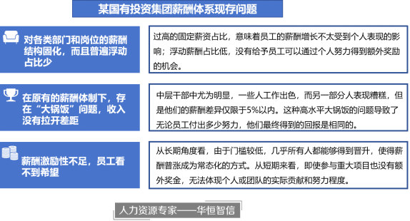 不合理的薪酬结构会导致员工对制度抱怨,努力工作也不一定拿到较高的工资,久而久之积极性不断下降。在本项目中,随着该集团的不断发展,重经营轻管理引发了一些问题,比如薪酬结构固化,员工的个人表现好坏与薪酬增长的相关性低;目前的薪酬结构,存在大锅饭的问题,干多干少一个样;薪酬激励性不足,出现了人员积极性差、留不住人才的现象。针对这些问题,华恒智信建议加大调整固浮比;加强薪酬与绩效的挂钩程度;引入特殊奖励,对员工的激励实现短期与长期相结合。