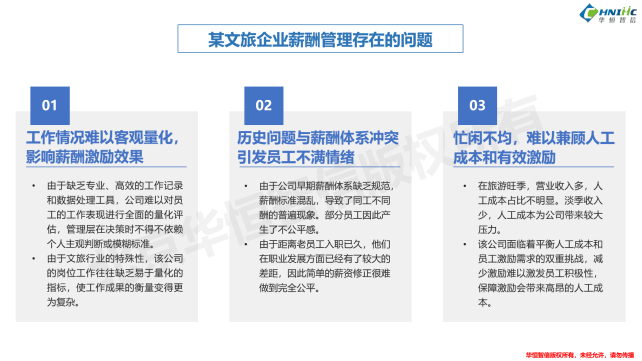 在本案例中,某文旅集团面临着因薪酬体系完善较晚,以及忙闲不均、工作难以量化等行业特性导致的多重薪酬管理问题。比如,工作情况难以客观量化,奖金发放过于依赖领导主管判断,影响激励效果;历史问题与当前薪酬体系存在冲突,存在同工不同酬的问题,引发员工不满情绪;存在忙闲不均的行业特点,难以兼顾人工成本和有效激励等。
