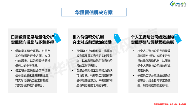 针对这些问题,华恒智信项目组给出建议:建立日常数据记录与量化分析体系,实现靶向激励与多劳多得;引入价值积分机制,突出对当前贡献的奖励,平衡旧有问题与现行制度之间的矛盾;将个人工资与公司绩效挂钩,实现薪酬与贡献紧密关联,有效减少淡季时的人工成本。