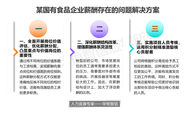 通过深入的分析和调研,针对以上几个方面的问题,华恒智信顾问专家团队提出了以下三个解决方案,帮助企业优化薪酬激励体系,激发员工积极性,实现企业经营效益的提高。