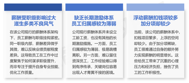 在长期发展中,该公司薪酬体系一直没有进行体系化的调整。而随着国企改革推进,该公司的薪酬体系反映出诸多弊病。例如,薪酬受职级影响过大、缺乏长期激励体系、扣钱项目较多加分项很少等,导致薪酬体系未能起到应有的激励作用,反而引发了员工积极性不足、团队氛围压抑等问题,极大阻碍了公司的持续发展。