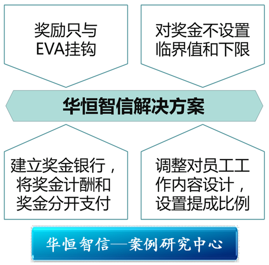 要想真正发挥每一名员工的工作积极性,关键就在于让员工与银行成为一个利益共同体,让员工感受到其收益是与其责任、能力、业绩的大小相挂钩的。鉴于这样的激励管理理念,针对该银行所存在的奖金分配系统不完善、员工消极被动的问题,华恒智信顾问团队建议:引入EVA奖金计划。其核心思想是将 EVA(经济增加值)与经营层以及员工的薪酬进行挂钩,即,按照一定比例将 EVA的一部分回报给经营层和员工,以“虚拟股东”的形式使经营层、员工更接近与股东的环境,促使管理者以及一般员工站在股东的角度进行思考,从而能够着眼公司的长远发展而做出比较好的企业规划,促进战略发展目标的实现。EVA 奖金计划的特点主要体现在以下几个方面: