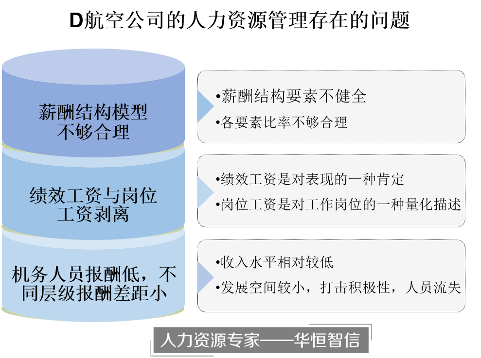 经过对D航空公司实际情况的详细了解,华恒智信专家团队认为D航空公司的人力资源管理存在以下问题: