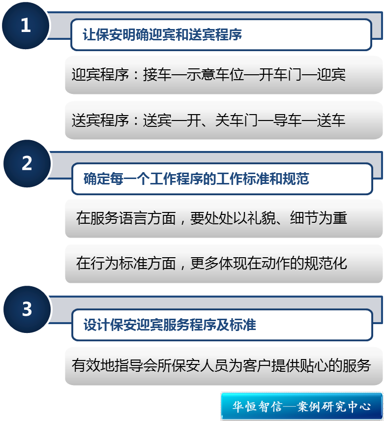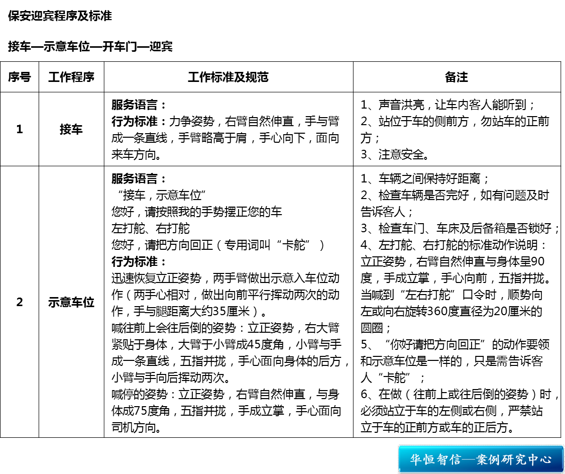 最后,为了更好地提升保安人员的服务水准,华恒智信顾问团队为会所设计了保安服务的规范程序与工作标准,有效地指导该会所保安人员为客户提供贴心的服务(详见下表:保安迎宾服务程序及标准)。