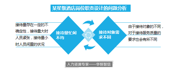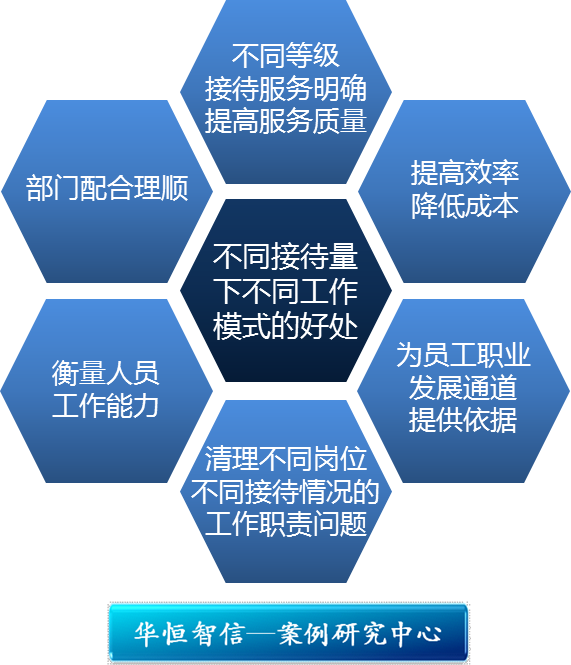 对于这种接待量和接待人员不同的状况,不同工作模式的设计,所带来的接待服务质量和要求就会有所不同,所带来的企业人工成本也会有所差别。如何在有限的人力资源的前提下,提升服务质量、形成企业特色,达到企业服务的高标准,华恒智信顾问专家的解决方案是:建议该酒店针对不同的接待对象 、不同的接待量采取不同的接待工作模式,即在不同的接待工作模式下,根据接待对象的不同,划分不同的接待等级标准,根据不同的接待等级标准,规定出不同的接待服务标准,确定不同的参与部门或岗位要求,确定不同的人员配置,将相互配合的部门的要求加以明确,将不同人员配置情况下人员的服务区域范围详细地加以界定,将各个涉及到接待服务的相关岗位的工作职责、工作要求加以明确,这样一方面将不同接待等级的接待服务要求明确了,一方面将相关部门之间的配合理顺了,各部门都可以明确在不同接待情况下,自己该做什么,不该做什么;同时还可以将现有人员的技能要求按照不同接待量加以规定,并将人员的能力在过程中加以衡量,为人员的晋升通道建设奠定基础 。