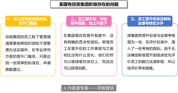 在项目开始后,北京华恒智信人力资源咨询公司项目组深入企业进行了调研,了解到目前公司在前期快速发展中,没有及时完善规范的管理基础,虽然针对员工序列建立了专业发展通道,但是在基础性的职级标准优化、完善等工作方面没有及时优化,缺少配套的管理数据支持。经过调研分析,公司目前主要存在如下关键问题: