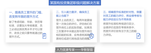 通过深入的分析和调研,针对以上几个方面的问题,华恒智信顾问专家团队提出了以下三个解决方案,帮助集团优化职级晋升体系,支持企业管理改善: