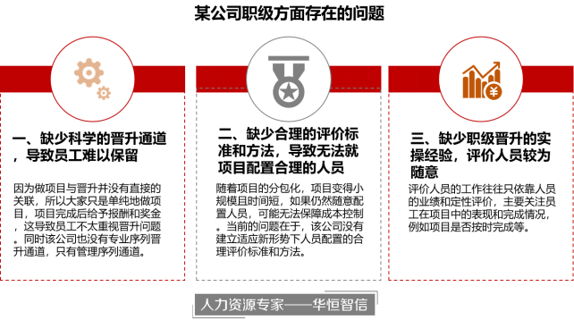 在项目开始后,北京华恒智信人力资源咨询公司项目组深入企业进行了调研,了解到目前公司在前期快速发展中,没有及时完善规范的管理基础,只对员工建立了管理序列的晋升通道,在基础性的职级评价标准、晋升流程等工作方面没有及时优化,缺少配套的管理数据支持。经过调研分析,公司目前主要存在如下关键问题: