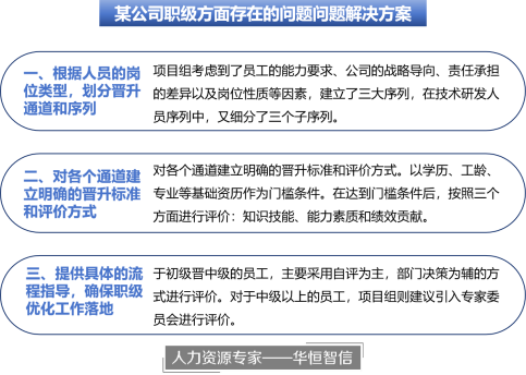 通过深入的分析和调研,针对以上几个方面的问题,华恒智信顾问专家团队提出了以下三个解决方案,帮助集团优化职级晋升体系,支持企业管理改善:
